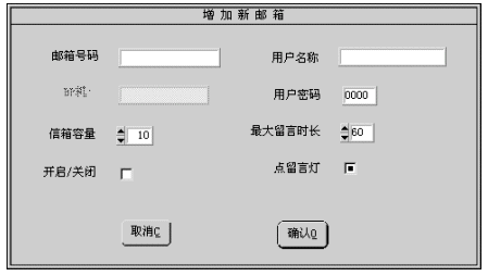 2). 除信箱號(hào)碼為必須輸入外,其它各項(xiàng)若不輸入,系統(tǒng)會(huì)按缺省值設(shè)置信箱參數(shù)。 3). 設(shè)置完成后按確認(rèn)按鈕即增加一個(gè)信箱號(hào)碼。若不想增加,按取消按鈕退出。