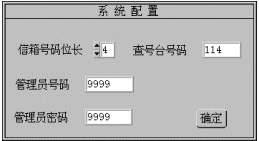 管理員號(hào)碼:管理員在系統(tǒng)維護(hù)時(shí)需拔打的信箱號(hào)碼(密碼缺省為9999)。