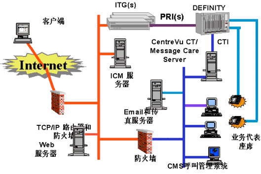 Internet呼叫中心(Internet Call Center簡稱ICC)是當(dāng)前的一個明顯趨勢。支持因特網(wǎng)作為呼叫中心的訪問渠道會極大增強(qiáng)呼叫中心的可用性。Internet用戶可以通過主頁瀏覽、電子郵件、在線Chat、IP語音電話等方式與話務(wù)員建立在線聯(lián)系,得到優(yōu)質(zhì)的服務(wù)。AVAYA的Internet呼叫中心解決方案支持用戶采用一條電話線進(jìn)行因特網(wǎng)和IP電話的訪問,ICM管理器與Web服務(wù)器建立連接,將到來的IP呼叫進(jìn)行自動分配,ITG IP電話網(wǎng)關(guān)實現(xiàn)將IP語音流轉(zhuǎn)換成語音信號,經(jīng)E1線送到Definity交換機(jī)后傳到話務(wù)員座席。座席和用戶可實現(xiàn)瀏覽器同步等功能。