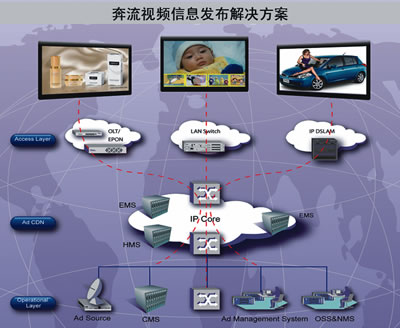 UT斯達康緊跟市場發(fā)展趨勢和運營商步伐,深入研究戶外液晶廣告業(yè)務(wù)的發(fā)展、大力推進廣告平臺的研發(fā)。2006年,UT斯達康推出了奔流(RollingStream)視頻信息發(fā)布解決方案(如圖2所示)。奔流視頻信息發(fā)布解決方案是以奔流(RollingStream)IPTV平臺為基礎(chǔ),結(jié)合戶外液晶廣告市場需求,融合運營商以視頻為主的綜合信息發(fā)布的需求,真正運營級的電信級解決方案。該方案可以幫助運營商實現(xiàn)融合信息服務(wù)和廣告業(yè)務(wù)的統(tǒng)一運營,幫助運營商開展兼具公益性和盈利性的信息發(fā)布業(yè)務(wù),運營商在推進社會信息化、造福公眾的同時,通過視頻廣告的運營,也能獲取盈利。該方案基于電信級平臺的穩(wěn)定性、安全性、擴展性設(shè)計要求,可支持百萬級大規(guī)模部署能力,可提供電信級質(zhì)量保證的服務(wù);該方案基于IP流媒體技術(shù),可通過IP網(wǎng)絡(luò)實時、精準(zhǔn)、互動地投放廣告內(nèi)容,從而可以支持豐富、新穎的廣告運營模式;該方案基于數(shù)字多媒體技術(shù),除了可以發(fā)布視頻廣告,還可以發(fā)布圖片、文字、消息等廣告內(nèi)容。