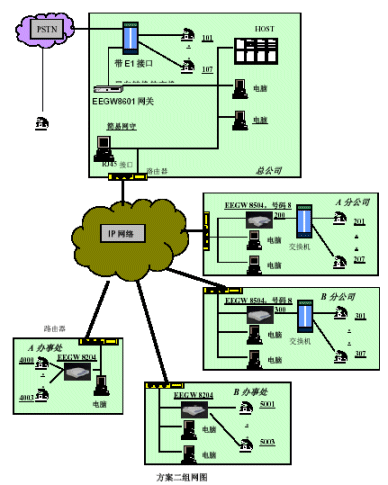 。。本方案有主要配置:總公司配備3臺EEGW8504FXO網(wǎng)關(guān)、四個分公司分別配備1臺EEGW8504FXO網(wǎng)關(guān),四個辦事處分別配備1臺EEGW8204FXO網(wǎng)關(guān)。在總公司出可以安裝EEGK8001簡易網(wǎng)閘。