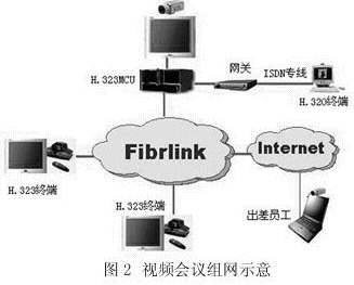 目前視頻會(huì)議系統(tǒng)主要有兩大類:一種基于H.320協(xié)議標(biāo)準(zhǔn),另一種基于H.323協(xié)議標(biāo)準(zhǔn)。H.320會(huì)議系統(tǒng)技術(shù)成熟,運(yùn)行穩(wěn)定,圖像質(zhì)量高,但業(yè)務(wù)功能單一,組網(wǎng)不夠靈活;H.323會(huì)議系統(tǒng)是最近兩年興起的視頻會(huì)議系統(tǒng),運(yùn)行在廣泛存在的IP網(wǎng)絡(luò)之上,以功能豐富、組網(wǎng)方便靈活等為主要特征,成為視頻會(huì)議系統(tǒng)的發(fā)展方向,但其視頻質(zhì)量很大程度上依賴于所承載的IP網(wǎng)絡(luò)的質(zhì)量。中電飛華公司基于FibrLINK平臺(tái),為用戶提供H.320、H.323以及H.320和H.323混合組網(wǎng)的視頻會(huì)議系統(tǒng)建設(shè),如圖2所示。
