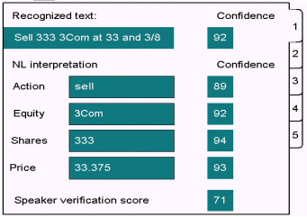 也可使用外部的應(yīng)用知識內(nèi)容來確定多結(jié)果中的哪一個是有效的。例如,經(jīng)紀(jì)業(yè)務(wù)應(yīng)用程序,它的用戶投資隨時間變化而變化。系統(tǒng)可使用簡單的語法來識別股票證券的名稱。識別時,系統(tǒng)產(chǎn)生一個最佳前N個股票名稱的清單,標(biāo)明假設(shè)的股票證券名稱。應(yīng)用程序然后將每個清單項(xiàng)目(由最佳到最差)和現(xiàn)有股票證券名稱進(jìn)行比較,從而為該用戶找到可能性最大的一個。下圖展示的是這些多結(jié)果情況,每個結(jié)果都可能有它自身的已被識別的文本、NL解釋和置信度分值。在這一例中,請求了五個識別結(jié)果。