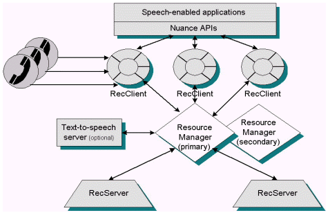 Nuance系統(tǒng)基于開放式客戶/服務(wù)機(jī)結(jié)構(gòu),特別為大型應(yīng)用程序所需的健壯性和可伸縮性而設(shè)計。呼叫者的講話由客戶端收集,而識別和鑒別處理的負(fù)載被平均分配到網(wǎng)絡(luò)上的多個分開的服務(wù)器上。