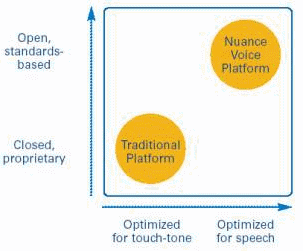 傳統(tǒng)的平臺是基于封閉的、非統(tǒng)一標準的技術并為按鍵式輸入應用而設計的,而Nuance NVP平臺是開放的、基于統(tǒng)一標準的語音平臺產(chǎn)品,它能夠支持客戶公司已有的IT投資和基礎設備,同時可以加入語音的應用,提高了信息傳遞的自動化程度和客戶的滿意度。