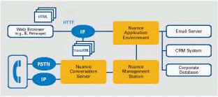 Nuance Conversation Server對話服務器包括了與Nuance 語音識別模塊集成在一起的VoiceXML解釋器,文語轉換器(TTS)以及聲紋鑒別軟件。通過標準的互聯(lián)網(wǎng)絡協(xié)議,Nuance 對話服務器能得到Nuance 應用環(huán)境中產(chǎn)生的VoiceXML應用程序。Nuance對話服務器通過廉價的、非定制 的語音卡或者VoIP (Voice over IP)的支持,還能提供對電話網(wǎng)的接口。