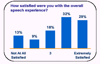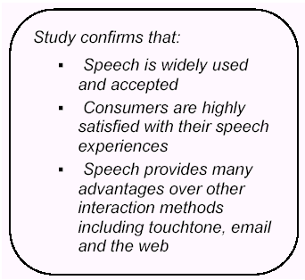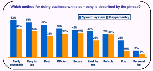此外,十個人中九個人認(rèn)為他們從使用語音服務(wù)中得到了在鍵盤式服務(wù)中得不到的價值不菲的好處,并有70%的人說如果語音服務(wù)系統(tǒng)取代了按鍵式系統(tǒng)的話,他們的效率也將得以提高。