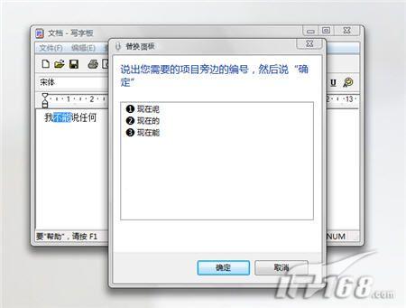 Vista在轉(zhuǎn)譯你的聽寫時很可能會產(chǎn)生錯誤。而只得慶幸的是它們能夠很容易地得到糾正。例如,如果你說“我現(xiàn)在能說任何”,而Vista輸入的是“我不能說任何”,這時你可以說“更正不能”,接著你就會看到一個清單,里面列有可替換的詞,如圖10所示。