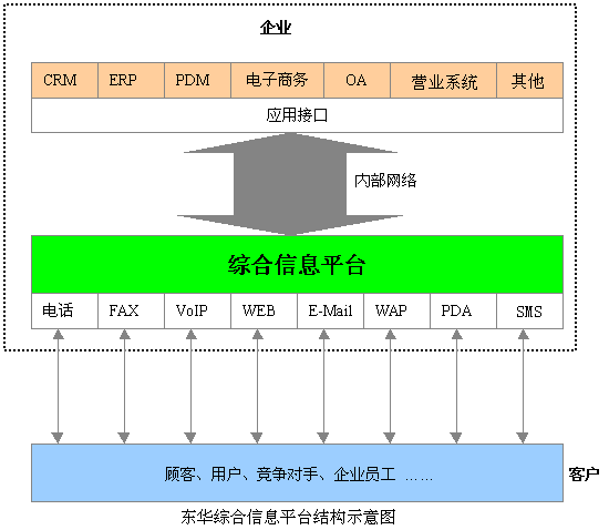 東華集團(tuán)綜合信息平臺(tái)系統(tǒng)可集中企業(yè)客戶(hù)服務(wù)的優(yōu)勢(shì)資源,采用人工業(yè)務(wù)代表服務(wù)與自動(dòng)語(yǔ)音服務(wù)相結(jié)合的形式,通過(guò)電話、Email、Web、尋呼、IP電話/傳真、視頻、段消息等接入方式和服務(wù)手段,向客戶(hù)提供業(yè)務(wù)受理、信息查詢(xún)、商品定購(gòu)服務(wù),以及接受客戶(hù)的咨詢(xún)、建議及投訴,也可以通過(guò)主動(dòng)撥出做社會(huì)調(diào)查、市場(chǎng)調(diào)查、商品直銷(xiāo)及資費(fèi)欠費(fèi)催繳等。