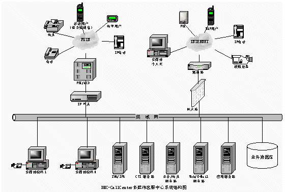 普通電話用戶(hù)通過(guò)PSTN接入DHC- UIPS綜合信息平臺(tái)系統(tǒng),接受話務(wù)員服務(wù)或自動(dòng)業(yè)務(wù)流程。傳真用戶(hù)進(jìn)入系統(tǒng)可以進(jìn)行傳真業(yè)務(wù)。計(jì)算機(jī)用戶(hù)也可以通過(guò)Internet訪問(wèn)企業(yè)客戶(hù)服務(wù)系統(tǒng)主頁(yè),獲得服務(wù)。同時(shí)計(jì)算機(jī)用戶(hù)也可以通過(guò)Internet利用網(wǎng)絡(luò)電話的功能要求話務(wù)員服務(wù)或自動(dòng)業(yè)務(wù)流程。