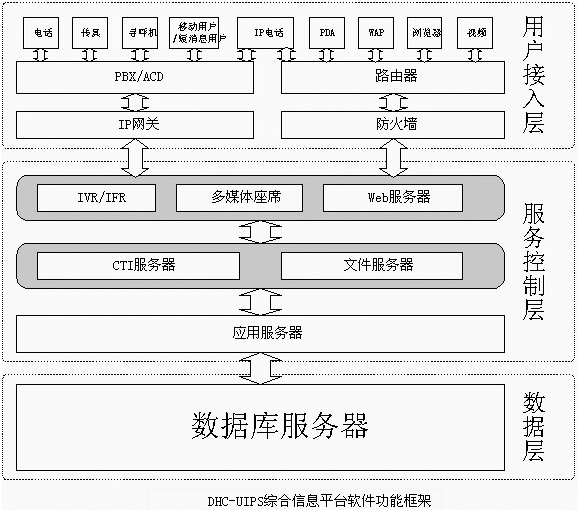 即DHC-UIPS綜合信息平臺(tái)的接入端,包括IVR流程、人工坐席等,它是用戶(hù)進(jìn)入多媒體客服中心客服系統(tǒng)的入口,它將直接面對(duì)用戶(hù)并收集各種信息。支持電話、傳真、電子郵件、WEB訪問(wèn)、WAP、PDA、IP電話、網(wǎng)絡(luò)電話、視頻電話等多種方式接入。
