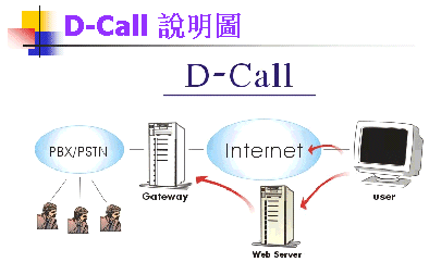 由金倚公司在貴網(wǎng)站的網(wǎng)頁(yè)上安裝D-CALL軟件,并配上金倚公司開(kāi)發(fā)的硬件,將您網(wǎng)站要指定D-CALL 直撥的電話號(hào)碼或分機(jī)設(shè)定在D-CALL程序中,就可以享受D-CALL的功能了。(需要的環(huán)境如右圖示