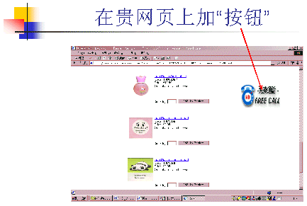 簡(jiǎn)單地說(shuō),就是當(dāng)有客戶瀏覽到網(wǎng)上購(gòu)物的網(wǎng)頁(yè)時(shí),若有任何疑問(wèn)或想立即購(gòu)買(mǎi),只要點(diǎn)擊在網(wǎng)頁(yè)上的“按鈕”鍵,就可以直接接通到網(wǎng)站的客服中心,實(shí)現(xiàn)即時(shí)地語(yǔ)音互動(dòng)。也不需再像以前那樣發(fā)E-MAIL或撥電話號(hào)碼了。效果可謂是立竿見(jiàn)影。(如圖示)