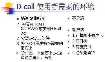 D-CALL指的是”Direct Call on Web”,提供電子商務(wù)中客戶與企業(yè)間網(wǎng)上實(shí)現(xiàn)網(wǎng)上實(shí)時(shí)語(yǔ)音互動(dòng)平臺(tái)。