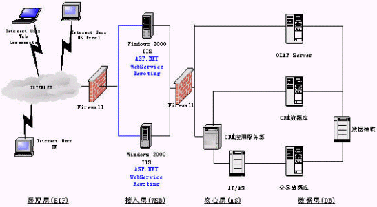 展現(xiàn)層實現(xiàn)定制化的、支持各種接入設(shè)備的統(tǒng)一消息平臺是非常必要的,它必將極大地促進(jìn)公司服務(wù)產(chǎn)品的發(fā)展。在展現(xiàn)層我們還強調(diào)企業(yè)信息門戶的建立:信息不是孤立的,需要一個統(tǒng)一的、互動的、個性化的、全面的綜合表現(xiàn)形式,以更方便公司人員對信息的獲取,作出正確的決策。使用ASP.Net和OfficeXP Web Components OLAP展示工具,并能有機的與辦公自動化工具結(jié)合起來。