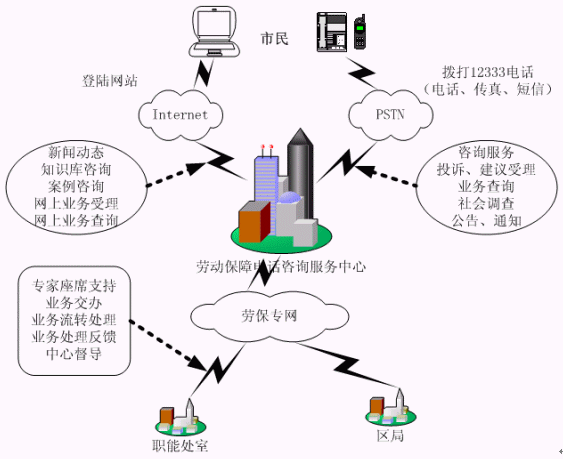 合肥市12333電話(huà)咨詢(xún)服務(wù)系統(tǒng)的建設(shè),使勞動(dòng)和社會(huì)保障業(yè)務(wù)延伸到市民、企業(yè)的身邊?朔赜蚝蜁r(shí)間的限制,實(shí)現(xiàn)了每天24小時(shí)不間斷地隨時(shí)提供服務(wù)。該系統(tǒng)的建設(shè)將原本分散在各部門(mén)的對(duì)外服務(wù)業(yè)務(wù)內(nèi)容,集中在一個(gè)統(tǒng)一的對(duì)外服務(wù)"窗口",并與就業(yè)、失業(yè)、養(yǎng)老、醫(yī)療、生育及勞動(dòng)關(guān)系等管理系統(tǒng)建立接口,實(shí)現(xiàn)資源共享,為勞動(dòng)者提供包括電話(huà)、傳真、電子郵件、因特網(wǎng)等多種方式熱線咨詢(xún)服務(wù),從而架起勞動(dòng)者與勞動(dòng)部門(mén)之間密切聯(lián)系的橋梁,使廣大勞動(dòng)群眾的權(quán)益真正落到了實(shí)處。樹(shù)立勞動(dòng)和社會(huì)保障行業(yè)系統(tǒng)的良好服務(wù)形象。推動(dòng)勞動(dòng)保障局管理和服務(wù)的社會(huì)化,實(shí)行全面的標(biāo)準(zhǔn)化、規(guī)范化、制度化和網(wǎng)絡(luò)化的完善的服務(wù)。
