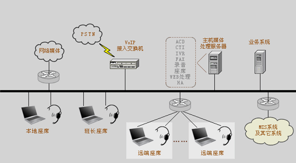在本次客戶服務(wù)中心系統(tǒng)升級中,我們采用了更加先進(jìn)的第四代呼叫中心系統(tǒng)作為客服系統(tǒng)的平臺?梢詫(shí)現(xiàn)的客戶聯(lián)絡(luò)方式已經(jīng)不僅僅局限于傳統(tǒng)的語音和傳真的呼叫形式,網(wǎng)絡(luò)電話、網(wǎng)絡(luò)傳真、Email、短消息、即時(shí)消息、互聯(lián)網(wǎng)應(yīng)用等都是與客戶聯(lián)絡(luò)的重要方式,涉及到的媒體載體也不僅是PSTN,還有基于VoIP技術(shù)的現(xiàn)代網(wǎng)絡(luò)、無線網(wǎng)絡(luò)等;也就是說第四代呼叫中心系統(tǒng)是一個(gè)融合網(wǎng)絡(luò)、語音、數(shù)據(jù)庫、視頻和安全技術(shù)的綜合信息服務(wù)平臺。系統(tǒng)結(jié)構(gòu)圖如下: