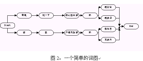 在語音識別中,語言模型是用來指導引擎進行語音識別的,它限定了一個識別引擎所能表達的語句類型。在我們常用的圖搜索引擎中,語言模型是通過語法來表示的,語法是由一系列表示某個領域的語言表達方式的規(guī)則組成的(語法的具體書寫規(guī)則見引擎使用說明書)。這些規(guī)則會被被轉換成詞圖的形式然后用來指導語音的識別。所謂的詞圖是指由詞作為節(jié)點的一個圖,從該圖的開始節(jié)點到末尾節(jié)點的任一條路徑都是一個有效合法的句子。圖2給出了一個簡單的詞圖。