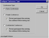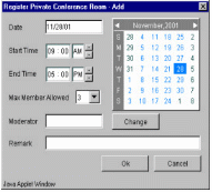 TeleConference系統(tǒng)內(nèi)的任一個(gè)分機(jī),都可以利用瀏覽器(Internet Browser)來預(yù)約會議時(shí)間,而參加會議的人可以在會議開始時(shí),自動打電話進(jìn)系統(tǒng)參加會議就像加入“聊天室“一樣簡單。