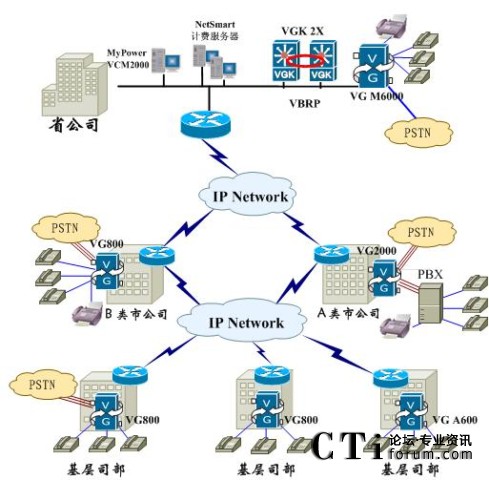 在此典型應(yīng)用中,省公司采用VG M6000,配置32FXO接入卡和E1中繼卡,實(shí)現(xiàn)大容量接入和本地PSTN落地;地市B采用VG800,配置FXO模擬接入卡和FXS模擬中繼卡,實(shí)現(xiàn)本地電話接入和PSTN落地;地市A采用VG2000,將PBX電話接入IP電話網(wǎng)絡(luò),并實(shí)現(xiàn)本地PSTN落地;基層公司根據(jù)容量需求,分別采用VG800或者VG A600實(shí)現(xiàn)電話接入。省公司配置兩臺邁普IP語音網(wǎng)守VGK 2X,運(yùn)行VBRP協(xié)議,實(shí)現(xiàn)網(wǎng)守?zé)醾,充分保證整個(gè)網(wǎng)絡(luò)的可靠性。