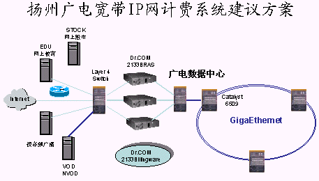 對(duì)于以上這些實(shí)際問(wèn)題,北京城市熱點(diǎn)的Dr.com(AAA)計(jì)費(fèi)系統(tǒng)給予了比較完滿的解決。下面我們通過(guò)揚(yáng)州有線網(wǎng)的具體方案來(lái)實(shí)際體驗(yàn)一下。