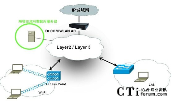 此次城市熱點為順德區(qū)政府提供的無線網(wǎng)絡AC接入方案,采用了兩步走的方式,既滿足了用戶的需求,又保證了無線網(wǎng)絡認證的安全問題。作為政府網(wǎng)絡,安全性極為重要,作為無線網(wǎng)絡采用空中信道的傳遞方式,在身份認證上要求更為嚴格。城市熱點的無線接入方案采用Portal認證頁面,可支持Portal服務器與BRAS和Radius服務器采用CHAP的認證方式、HTTPS的登錄頁面方式和手機短信獲得動態(tài)密碼的方式進行用戶身份認證,最大限度的保證了用戶身份的安全性和準確性。