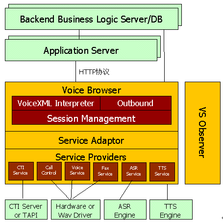 用于存放和產(chǎn)生VoiceXML腳本,可以是文件系統(tǒng)或WEB服務(wù)器,一般文件系統(tǒng)應(yīng)用于靜態(tài)腳本,WEB服務(wù)器應(yīng)用于動態(tài)腳本;應(yīng)用邏輯組件或中間件,進行事務(wù)處理。