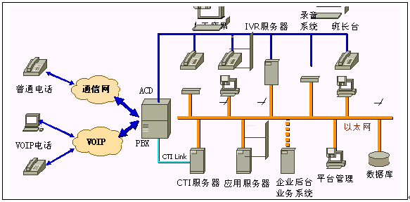 ·PBX/ACD:實現(xiàn)電話呼入、呼出和話務(wù)管理等功能,提供自動排隊機(jī)系統(tǒng),實現(xiàn)對來話的均衡分配