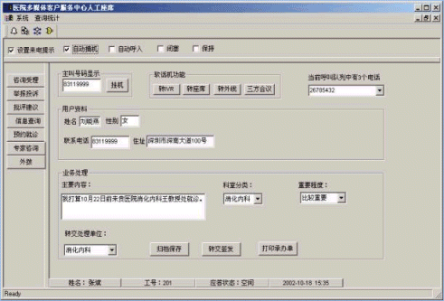 。。系統(tǒng)通過(guò)計(jì)算機(jī)語(yǔ)音自動(dòng)應(yīng)答設(shè)備或人工座席與患者建立聯(lián)系,檢索業(yè)務(wù)數(shù)據(jù)庫(kù),既可以直接播放病人所需的咨詢信息、醫(yī)療費(fèi)用明細(xì)查詢、遠(yuǎn)程就診掛號(hào),又可以接受患者的投訴舉報(bào)或求助,向醫(yī)院相關(guān)科室或負(fù)責(zé)人轉(zhuǎn)交相應(yīng)投訴建議或求助信息,使問(wèn)題能夠在最快的時(shí)間內(nèi)得到最好的解決,這種交互式的服務(wù)模式和服務(wù)手段保證了溝通的靈活性和高效性,提高了患者對(duì)醫(yī)院的滿意度和信任度。