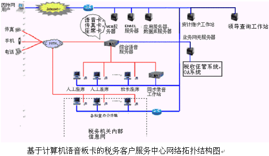 對于20個以下人工座席的中小型稅務客戶服務中心系統(tǒng),則建議使用基于計算機語音板卡的方式,可以減少投資,同時具有良好的系統(tǒng)性能;對于大型的稅務客戶服務中心系統(tǒng),可選用排隊交換機作為語音接入設備,以保障系統(tǒng)的高可靠性和穩(wěn)定性;大大提高了系統(tǒng)的適應面。