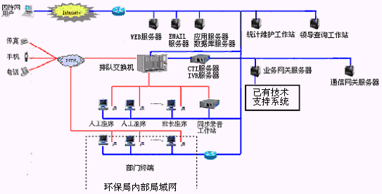 該12369環(huán)保熱線系統(tǒng)主要是由具有排隊功能的交換機(jī)或帶語音板卡的工控機(jī)、CTI服務(wù)器、IVR(交互式語音應(yīng)答)/IFR(交互式傳真應(yīng)答)子系統(tǒng)、人工座席子系統(tǒng)、應(yīng)用服務(wù)器、數(shù)據(jù)庫服務(wù)器、業(yè)務(wù)網(wǎng)關(guān)子系統(tǒng)、通信網(wǎng)關(guān)子系統(tǒng)等硬件設(shè)備和應(yīng)用軟件組成。