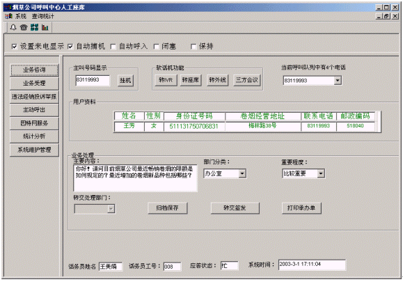 客戶打入電話后,當(dāng)系統(tǒng)的自動(dòng)語(yǔ)音應(yīng)答子系統(tǒng)無(wú)法解決客戶問(wèn)題時(shí),客戶可選擇人工服務(wù),由客戶服務(wù)代表直接接聽客戶電話,處理并解決客戶問(wèn)題。此時(shí)客戶同座席話務(wù)人員直接溝通,并同時(shí)記錄下該客戶的聯(lián)系方式,將相關(guān)數(shù)據(jù)添加入系統(tǒng)數(shù)據(jù)庫(kù);也可以在數(shù)據(jù)庫(kù)的支持下處理傳真業(yè)務(wù),電子郵件,計(jì)算機(jī)文件傳輸、滿意度調(diào)查等。