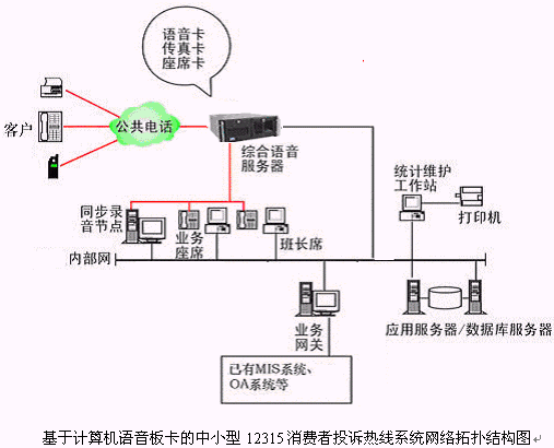 本系統(tǒng)物理結(jié)構(gòu)由帶語音板卡的高性能工控機(稱為綜合語音服務(wù)器,在功能上可以分為CTI服務(wù)器、IVR(交互式語音應(yīng)答)/IFR服務(wù)器、統(tǒng)計維護管理工作站、數(shù)據(jù)庫/應(yīng)用服務(wù)器、錄音留言工作站、業(yè)務(wù)網(wǎng)關(guān)服務(wù)器、業(yè)務(wù)代表座席、網(wǎng)絡(luò)系統(tǒng)等和應(yīng)用軟件構(gòu)成。