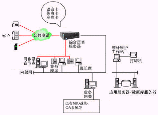 本系統(tǒng)物理結(jié)構(gòu)由帶語音板卡的高性能工控機(稱為綜合語音服務(wù)器,在功能上可以分為CTI服務(wù)器、IVR(交互式語音應(yīng)答)/IFR服務(wù)器、統(tǒng)計維護管理工作站、數(shù)據(jù)庫/應(yīng)用服務(wù)器、錄音留言工作站、業(yè)務(wù)網(wǎng)關(guān)服務(wù)器、業(yè)務(wù)代表座席、網(wǎng)絡(luò)系統(tǒng)等和應(yīng)用軟件構(gòu)成。