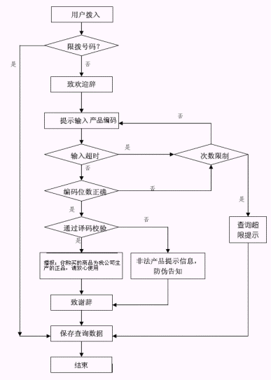 客戶通過(guò)撥打企業(yè)指定的電話號(hào)碼進(jìn)入本系統(tǒng),在電話語(yǔ)音提示引導(dǎo)下輸入產(chǎn)品(防偽)序列號(hào),系統(tǒng)會(huì)自動(dòng)從企業(yè)產(chǎn)品數(shù)據(jù)庫(kù)中查詢到該序列號(hào)是否存在,出廠時(shí)間等產(chǎn)品防偽信息,對(duì)于已經(jīng)被查詢過(guò)的產(chǎn)品(防偽)序列號(hào),系統(tǒng)會(huì)自動(dòng)報(bào)讀上次被查詢過(guò)的時(shí)間。