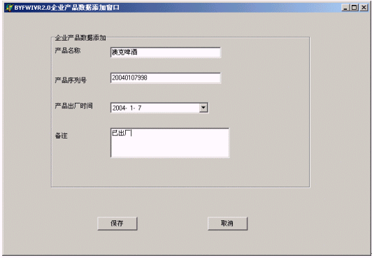 在企業(yè)產(chǎn)品數(shù)據(jù)庫(kù)維護(hù)窗口,用戶可以維護(hù)企業(yè)產(chǎn)品名稱,產(chǎn)品序列號(hào),產(chǎn)品出廠時(shí)間等信息,以便供客戶作防偽自動(dòng)語(yǔ)音查詢使用。