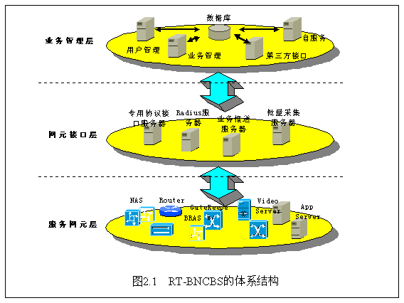 RT-BNCBS管理計(jì)費(fèi)平臺(tái)從邏輯上分為三層:服務(wù)網(wǎng)元層、網(wǎng)元接口層和業(yè)務(wù)管理層。如圖1所示。