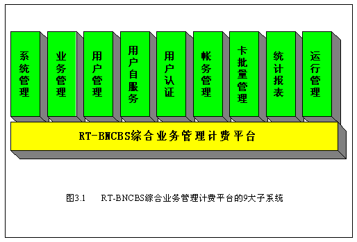從系統(tǒng)接口角度,我們把RT-BNCBS綜合業(yè)務(wù)管理計(jì)費(fèi)平臺(tái)分成9大子系統(tǒng),如圖4.1所示: