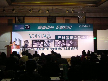 2004年2月19日,NTT DATA(中國)有限公司在北京長富宮飯店舉行了主題為"卓越平臺,無限應用"的VOISTAGE產品發(fā)布及應用研討會,在會上發(fā)布了CTI產品VOISTAGE。來自日本NTT DATA總公司的高層在會上發(fā)表主題演講時表示,NTT DATA將與戰(zhàn)略合作伙伴東進公司攜手共同大力推進VOISTAGE產品在中國中小企業(yè)級市場中的應用。