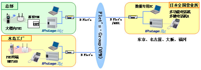 SX”通過SIP協(xié)作的IP電話系統(tǒng)。系統(tǒng)中所采用的“IPstage MX/SX”通過NTT西日本的VPN服務(wù)“Flet's・Group”相互連接,實現(xiàn)高音質(zhì)的內(nèi)線環(huán)境。使用內(nèi)線電話號碼進(jìn)行事業(yè)所之間的通話聯(lián)系,可以直接與想聯(lián)系的對象通話,無需傳叫電話。進(jìn)而,由于工廠采用了沖電氣所制造的PHS終端“UM7588”,可以在工廠任何地方實現(xiàn)直接電話聯(lián)系。導(dǎo)入該系統(tǒng)后,即使業(yè)務(wù)場所分處幾地,也能成功實現(xiàn)員工間的迅速溝通。