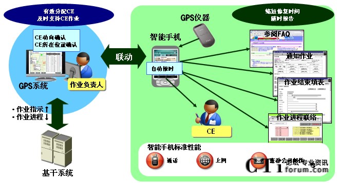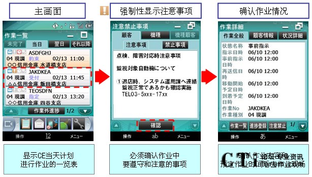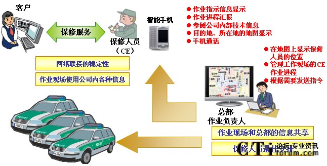 “MoBiz AP for CE支持系統(tǒng)”是在支持保修人員在工作現(xiàn)場作業(yè)的同時,實現(xiàn)總部對工作現(xiàn)場“可視化”管理的應用程序軟件包。