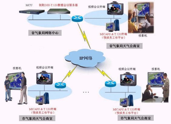 在上圖的應(yīng)用案例中,DSS-T.120數(shù)據(jù)會議服務(wù)器和MCU通常放置在省氣象局網(wǎng)絡(luò)中心,視頻會議終端和預(yù)報員工作平臺(MICAPS系統(tǒng))放置在各級氣象部門的天氣會商室中。在進行遠程可視天氣會商時,系統(tǒng)通過MCU和視頻會議終端進行視頻、音頻的交互;通過DSS-T.120數(shù)據(jù)會議服務(wù)器和運行在預(yù)報員工作平臺上的T.120終端軟件進行數(shù)據(jù)的交互,各級預(yù)報員在彼此之間看到圖像聽到聲音的同時,可以看到正在做匯報的預(yù)報員共享的MICAPS系統(tǒng)中的內(nèi)容,如高空圖、地面圖、云圖等預(yù)報基礎(chǔ)素材,觀看效果如同在本地會商室一樣。在本案例中通過T.120數(shù)據(jù)會議系統(tǒng)與視頻會議系統(tǒng)的配合,可以進行視頻、音頻、數(shù)據(jù)全面的交互,真正實現(xiàn)了預(yù)報員之間"面對面"的交流。