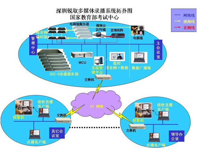 國家教育部考試中心為了對高考等大型考試實時性指導、監(jiān)考、培訓等,特建立了視頻會議系統(tǒng)、監(jiān)考系統(tǒng)。為了使整個系統(tǒng)更完善、應用價值更高,因此在此基礎上配置了銳取多媒體錄播系統(tǒng)。不僅實現(xiàn)了與各地考試中心及考點的圖像、語音和數(shù)據(jù)的交互通訊,還可以輔助系統(tǒng)完成視頻會議、監(jiān)考系統(tǒng)及培訓的錄制、直播和點播功能,錄制、直播和點播的內容包括了所有考試中心、考點圖像以及聲音和數(shù)據(jù)信號。