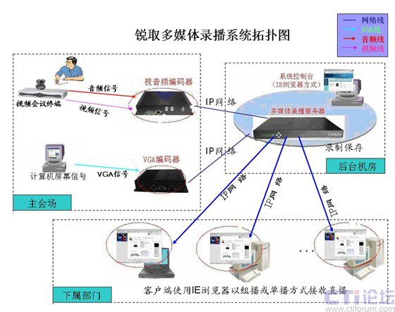 如上圖所示,硬件系統(tǒng)采用了前后臺分離的模式,前端的視音頻編碼器將從終端上采集的視音頻信號與VGA編碼器采集的VGA信號進(jìn)行編碼,通過內(nèi)部專屬網(wǎng)絡(luò)傳輸?shù)胶笈_機房的錄播服務(wù)器中,通過服務(wù)器內(nèi)部功能模塊,不僅將整個會議或者培訓(xùn)現(xiàn)場的視音頻與電腦桌面內(nèi)容同步錄制保存在專屬硬盤中,同時將上述采集內(nèi)容實時轉(zhuǎn)發(fā)直播到用戶局域網(wǎng)中。通過錄播系統(tǒng)的身份驗證機制,通過連接到網(wǎng)絡(luò)中的任意一臺PC即可接收直播的內(nèi)容。同時錄制保存在專屬硬盤上的內(nèi)容還可以后期點播回訪(需身份驗證)。