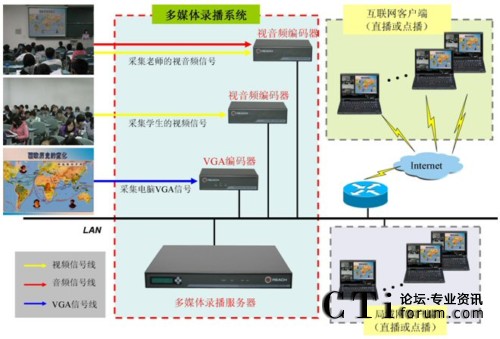 廣州市旅游職業(yè)學(xué)校多媒體錄播系統(tǒng)組網(wǎng)如上圖所示。在本項(xiàng)目中編碼器和多媒體錄播服務(wù)器分別部署在教室和機(jī)房?jī)?nèi),前端的視音頻編碼器采集老師、學(xué)生的視音頻信號(hào),VGA編碼器采集PPT內(nèi)容,編碼器采集信號(hào)并編碼后通過(guò)網(wǎng)絡(luò)發(fā)送給多媒體錄播服務(wù)器,多媒體錄播服務(wù)器接收并實(shí)現(xiàn)同步錄制、直播及事后點(diǎn)播。老師、學(xué)生可在教室、辦公室、宿舍等任何可以連接校園網(wǎng)的地方實(shí)時(shí)觀看教室內(nèi)進(jìn)行的課程,可滿(mǎn)足日常多媒體教學(xué)、課件錄制、微格教學(xué)等應(yīng)用的需要。