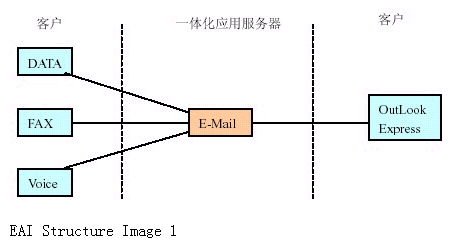 如果我們把各種信息(電話(huà)、傳真、數(shù)據(jù))在一體化應(yīng)用服務(wù)器上統(tǒng)一為E-Mail 形式在企業(yè)內(nèi)部或INTERNET 郵件系統(tǒng)轉(zhuǎn)發(fā)。實(shí)現(xiàn)起來(lái)就較簡(jiǎn)單,如下圖所示: