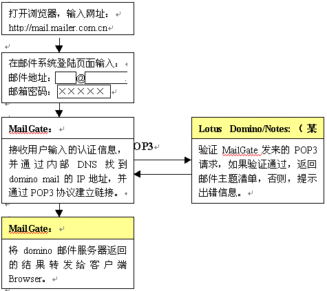 (1) 在不改變現(xiàn)有網(wǎng)絡(luò)硬件、軟件環(huán)境的情況下,添加一臺(tái)郵件網(wǎng)關(guān)服務(wù)器,通過統(tǒng)一的web登陸界面,輸入Email地址和密碼后,金笛?郵件網(wǎng)關(guān)會(huì)自動(dòng)根據(jù)內(nèi)部DNS找到該用戶所在的Domino Mail Server, 并通過標(biāo)準(zhǔn)郵件協(xié)議POP3提取該用戶的郵件,以web頁面形式顯示在用戶屏幕上。