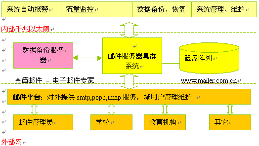 本項目采用金笛集群郵件系統(tǒng),通過兩臺IBM PC服務器實現(xiàn)高可用性。支持SMTP, POP3,IMAP等主流協(xié)議,支持WebMail,支持郵件列表等功能,同時要求兼容性好,與網(wǎng)站其他業(yè)務系統(tǒng)沒有沖突。