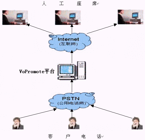 VoPromote語音平臺(tái)是基于W3C組織制定的VoiceXML標(biāo)準(zhǔn)開發(fā)的語音平臺(tái)。它對各個(gè)功能模塊的實(shí)現(xiàn)技術(shù)要求低且與國際標(biāo)準(zhǔn)兼容,在此基礎(chǔ)上再添VOIP功能更是如虎添翼。其VOIP工作模式圖如下:
