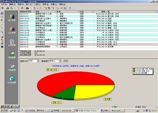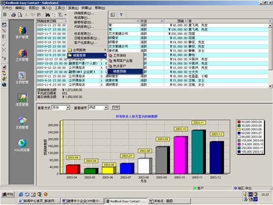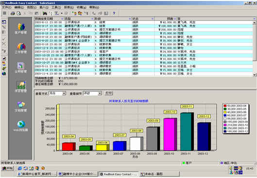 可根據(jù)月份、項(xiàng)目階段、聯(lián)系人、客戶、項(xiàng)目級別、銷售代表等條件進(jìn)行查看項(xiàng)目細(xì)節(jié),其中有詳細(xì)項(xiàng)目情況列表,也包括圖示。